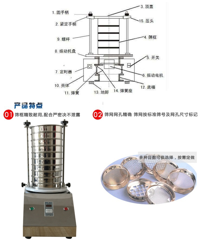 三、把被(bei)檢物料放入最上(shang)(shang)端的標(biao)準(zhun)篩(shai)(shai)具(ju)里,(或蓋上(shang)(shang)標(biao)準(zhun)篩(shai)(shai)具(ju)上(shang)(shang)蓋)然后用套在絲(si)柱上(shang)(shang)的篩(shai)(shai)分(fen)頭壓(ya)(ya)住標(biao)準(zhun)篩(shai)(shai)具(ju)旋緊(jin)(jin)絲(si)柱上(shang)(shang)的螺母來壓(ya)(ya)緊(jin)(jin)標(biao)準(zhun)篩(shai)(shai)具(ju)。(注意(yi):兩側要用力一致,然后用鎖定(ding)螺絲(si)鎖緊(jin)(jin)。)